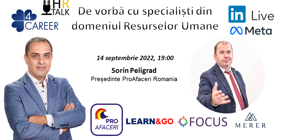 Hai LIVE on-line, pe LinkedIn la discuția cu specialiștii în domeniul resurselor umane, “HR Talk”, făcând parte din seria de evenimente organizate de către 4CAREER – Welcome to your career! Evenimentul “HR Talk” este locul în care managerii, directorii de resurse umane din marile companii locale, nationale si internationale, trainerii, consultanţii şi headhunterii, consultanții resurse umane se întâlnesc pentru a căuta soluţii pentru dilemele pe care le au în managementul oamenilor. Alături de specialiștii cu experiență vastă, întâlnirile vor oferi know-how valoros și util, fiind dedicate pieței de HR ce își propun să abordeze subiecte dedicate profesioniștilor din departamentele de HR (societăți private și instituții publice), companiile de recrutare, organizațiile cu profil uman și consiliere în carieră etc. Avem posibilitatea să vorbim, printre altele, despre: